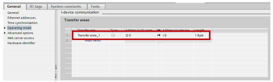 با این مرحله، ارتباط منطقی بین CPU 1214C (بهعنوان I-Device) و CPU مرکزی (مثلاً 1516 بهعنوان IO Controller) برقرار میشود و در ادامه میتوان ناحیههای داده (Transfer Areas) را برای تبادل ورودی و خروجیها تعریف کرد.
